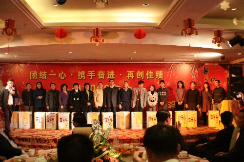 春節團拜會(huì )上公司董事長(cháng)黃鼎龍(中)給抽中特等獎的員工發(fā)獎并合影留念